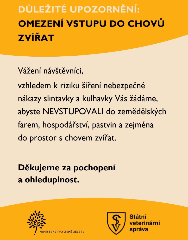 v souvislosti s doporučením Státní veterinární správy žádáme všechny o zvýšenou opatrnost a omezení pohybu v oblastech místních farem.