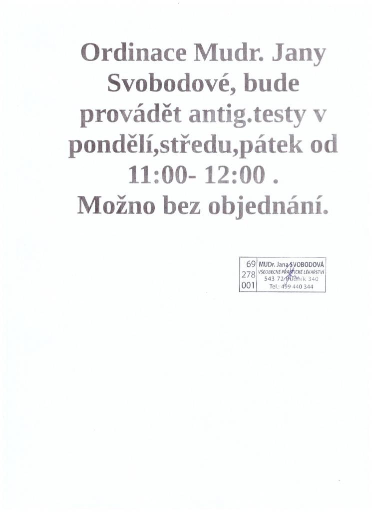 Ordinace MUDr. Jany Svobodové, bude provádět antigenní testování ve dnech pondělí, středa a pátek vždy od 11:00 do 12:00. Antigenní testování je pro potřeby kadeřnictví a kosmetiky, a to i bez předchozího objednání. Testování bude probíhat od pondělí 3.5.2021.