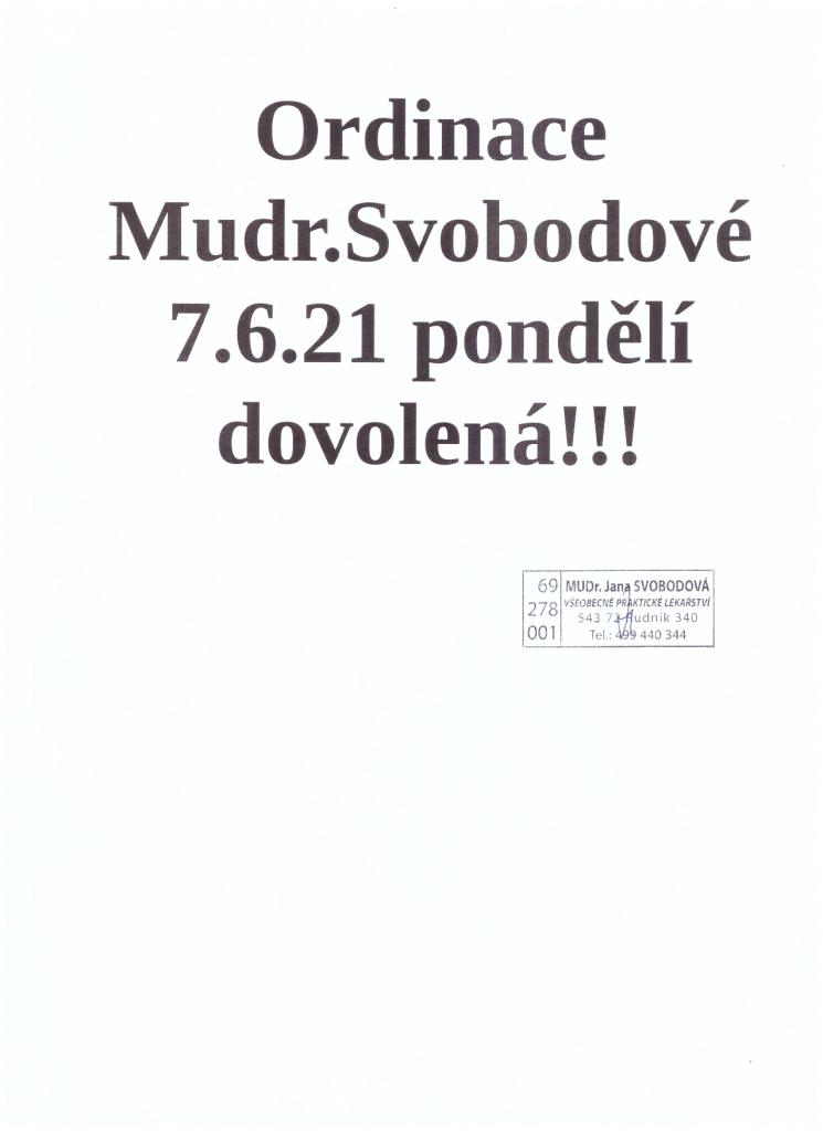 Ordinace MUDr. Svobodové v pondělí 7.6.2021 uzavřena z důvodu čerpání dovolené.