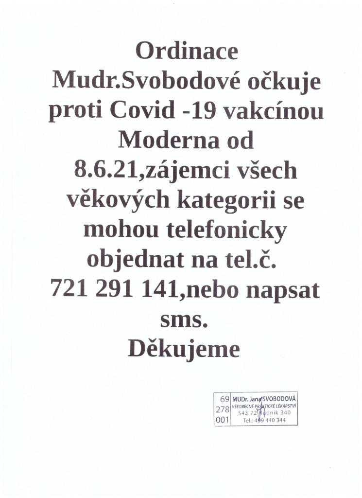 Ordinace MUDr. Svobodové očkuje proti Covid-19 vakcínou Moderna od 8.6.2021. Zájemci všech věkových kategorií se mohou telefonicky objednat na tel. č. 721 291 141, nebo napsat sms.
