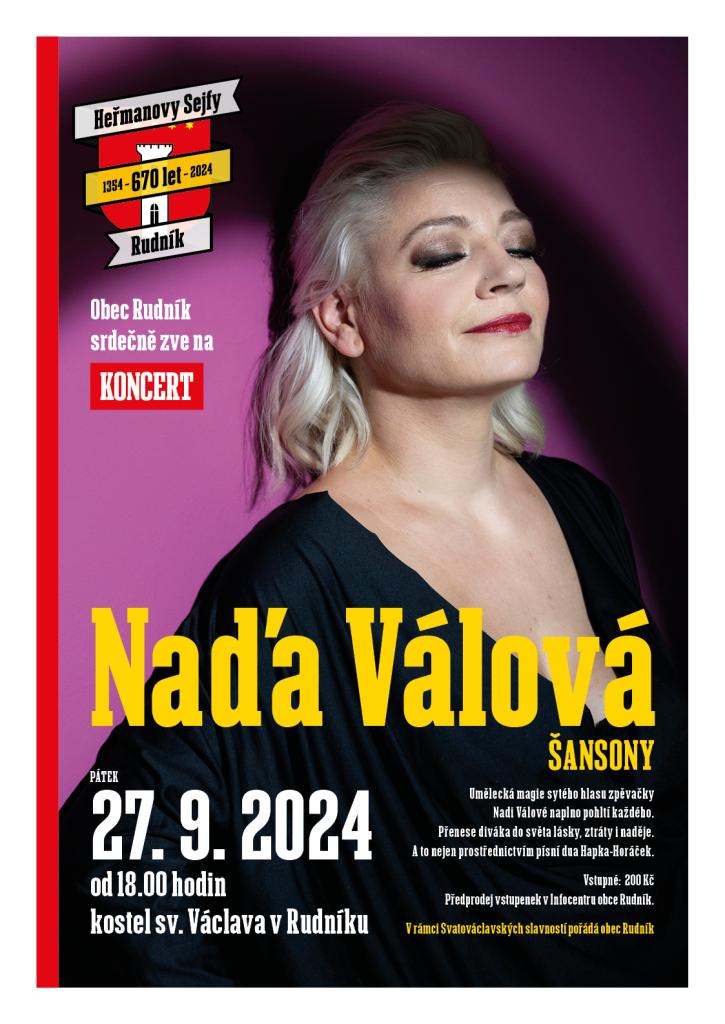 Koncert zpěvačky Nadi Válové za doprovodu elektronického klavíru. Nezaměnitelný hlas a výjimečné prostředí kostela sv. Václava v Rudníku. Umělecká magie zpěvačky Nadi Válové naplno pohltí každého, kdo je na koncertě divákem, pak už se stáváte součástí a dobrovolně se necháváte přenášet do světa lásky, ztráty a naděje.